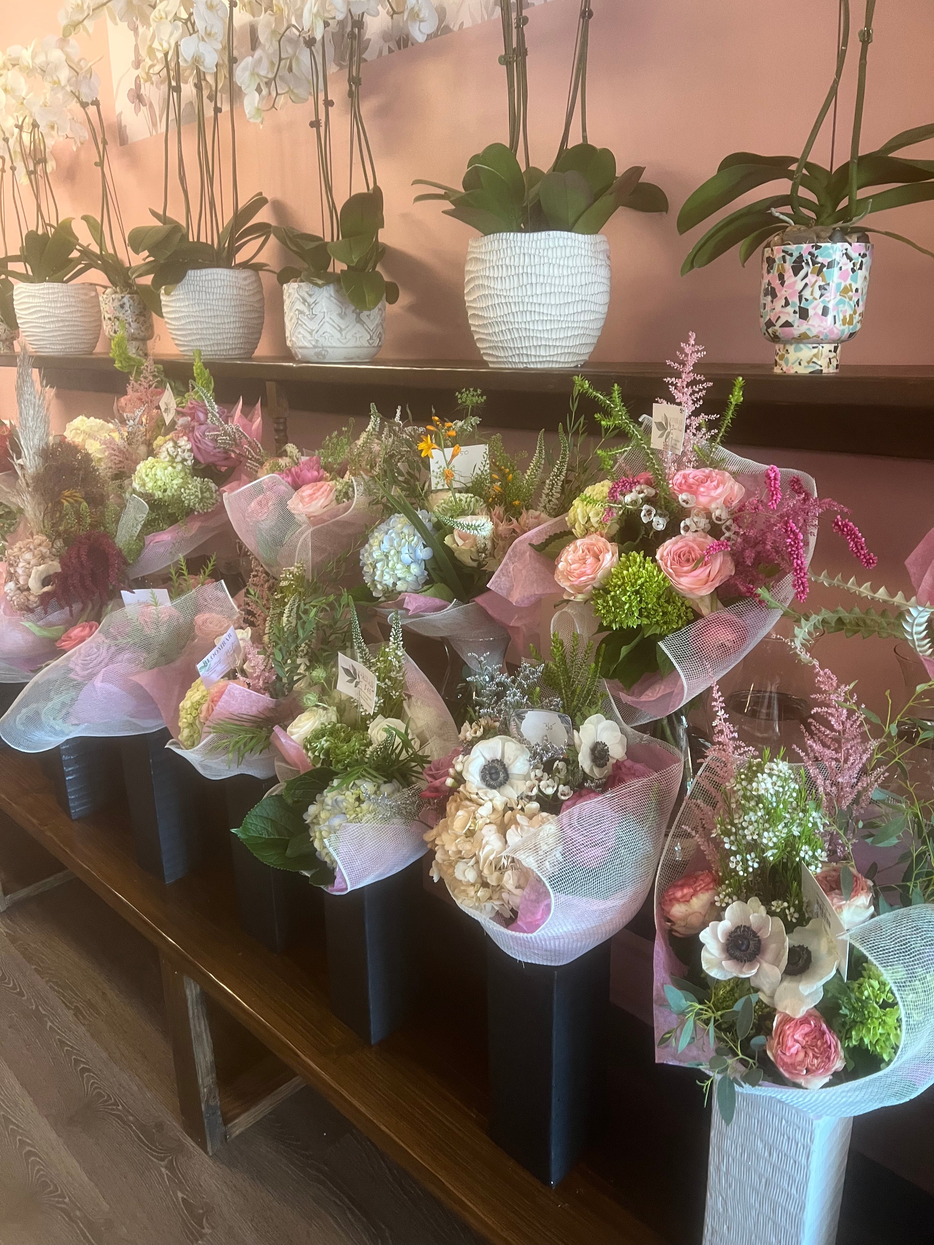 We offer Grab & Go Bouquets Wed-Friday in both locations. Prices start at $40 for pickups or order online for a more robust arrangement.